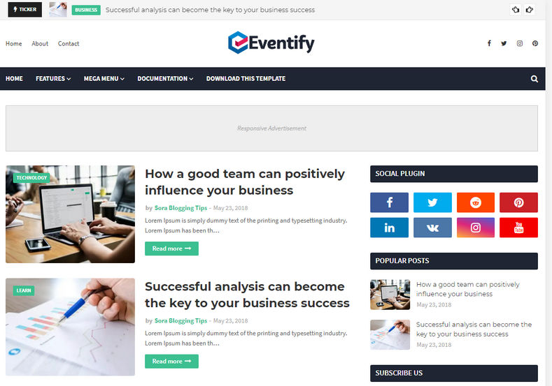 Eventify Blogger Template is SEO optimized and responsive blogger theme with tons of great features. It carries updated schema meta tags and also bread crumb structure. This amazing theme has the functionality of google rich results and also supported a replacement generation framework. the extra layout features and therefore the minimal commenting system makes it stand in particular . The easy-to-understand typography is predicated on Google’s latest fonts. it's clean and really easy to read with a chic design. This theme by the blogger is entirely customizable. you'll perform changes in color, switching widgets, layout, background, and lots of others with this theme. this is often because it supports blogger template customizers. Furthermore, the mobile-friendly nature of the theme makes it perfect for all aspect ratios. This feature-enriched theme helps in creating professional blogs within no time. you'll easily create authority, politics, news, events, and other blogs. Seo Ready, Browser Compatibility, Responsive, Adapted From WordPress, Social Bookmark Ready, Post Thumbnails, Ads Ready, sink Menu, White, Black, Blue, Fashion, Elegant, Simple, 2 Columns, WhatsApp Sharing, Magazine, News, Breadcrumb Navigation Ready, Business, Blogger Layout Version 3.0, 1 Right Sidebar, Right Sidebar, 2 Columns, 3 Columns Footer, AMP, Google, Fast Loading, Mega Menu.